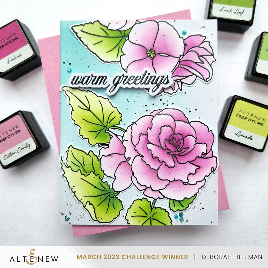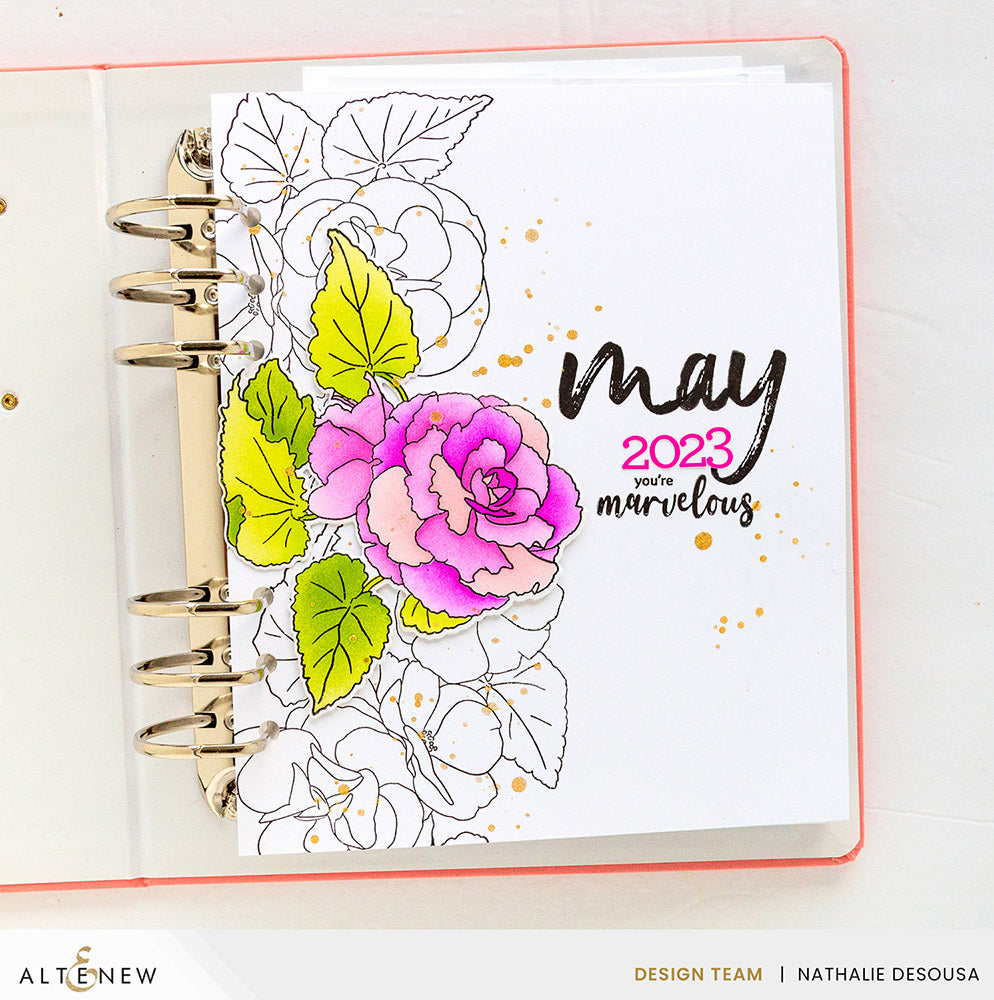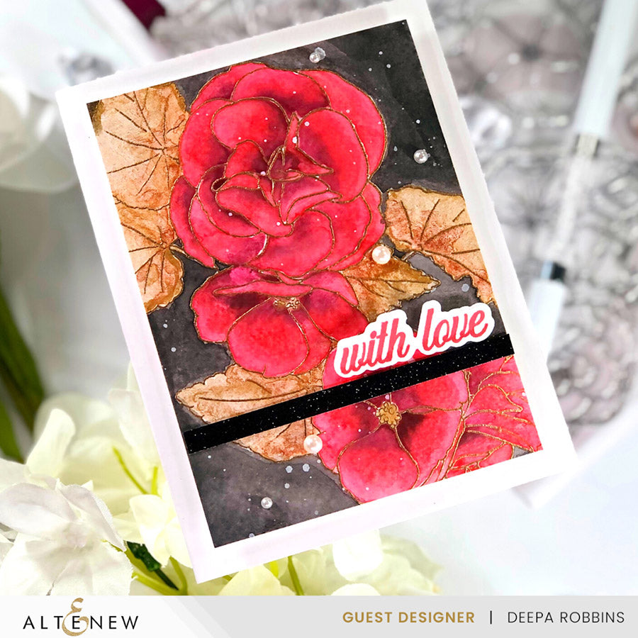 The simple coloring stencil set allows you to effortlessly add color to the Frilly Begonia flowers and leaves. Simply align each stencil with the outline image and use a blending brush to blend in your favorite ink colors.