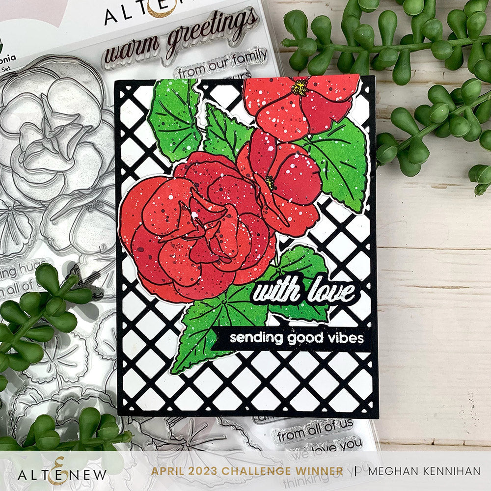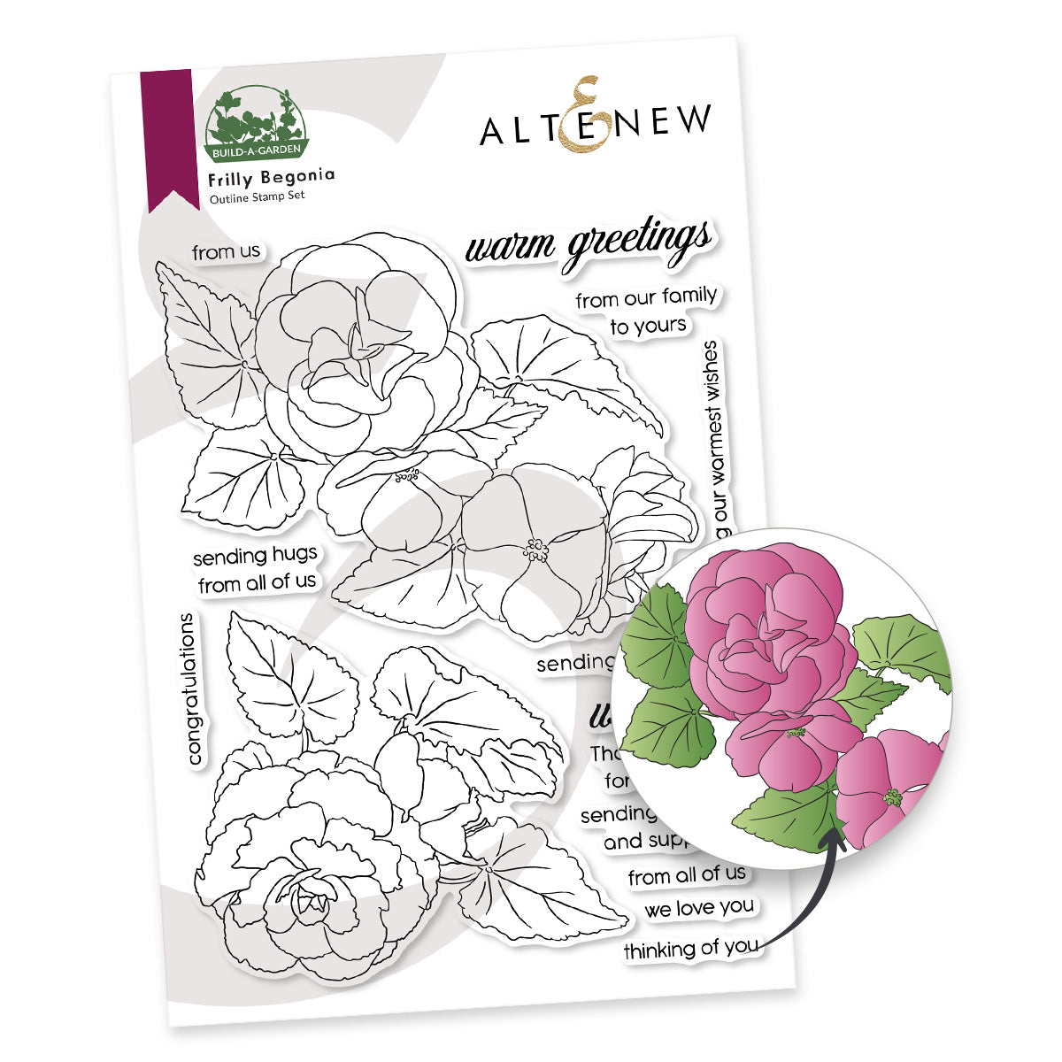 The Build-A-Garden: Frilly Begonia Stamp Set showcases two exquisite arrangements of begonia flowers while capturing their delicate beauty and frilly texture. Each arrangement is meticulously illustrated, highlighting the intricate details of the petals, leaves, and stems. In addition, the stamp set includes a collection of heartfelt and versatile greetings, designed to convey warmth and thoughtfulness. There are 15 stamps in this set.