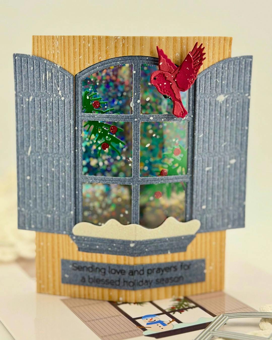 The Through the Window Die Set includes a window frame, shutters, a plant holder, and additional decorative elements. The leaves, tree branch, flowers, grass, and a cute little snowman will allow you to create scenes for all four seasons of the year!