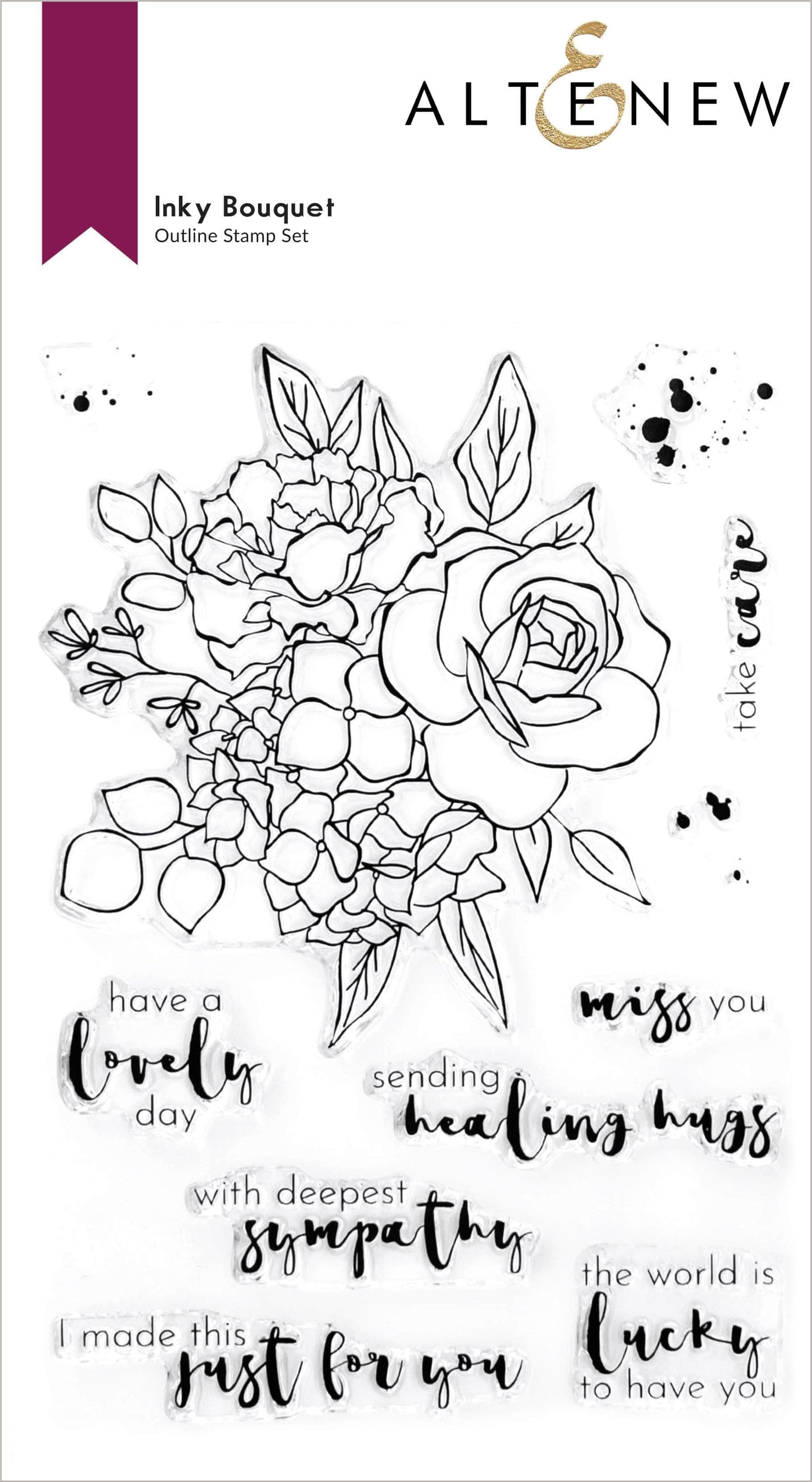 Inspired by pen and ink drawings, the 6" x 8" Inky Bouquet Stamp Set features a gorgeous floral bouquet of a rose, peony, and hydrangea flanked by luscious greenery. It is paired with a trio of ink splotches and seven versatile sentiments.