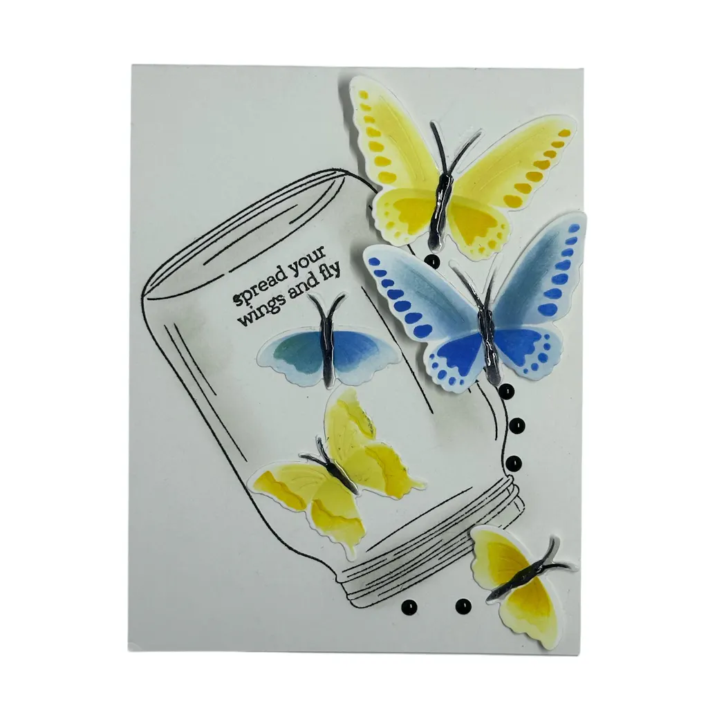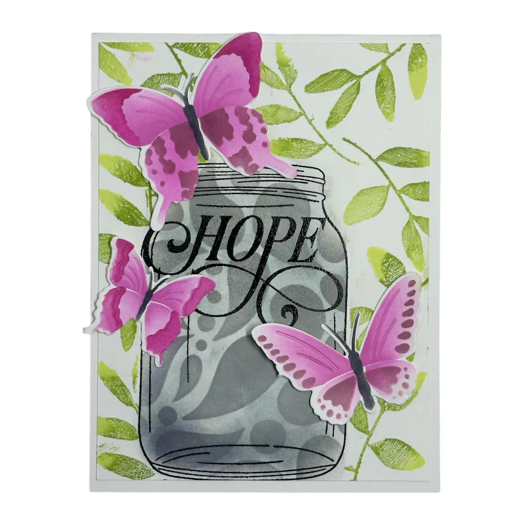 The 6" x 8" Craft Your Life Project Kit: Butterfly Garden Stamp Set features a beautifully designed jar for showcasing stenciled butterflies from the included stencil set, along with 3 distinct leaf branches for stunning arrangements or wreaths. This set includes the 4 main sentiments in a delightful swirly font & supporting sentiments for endless mix-and-match possibilities, allowing you to create projects that capture the essence of a butterfly garden!