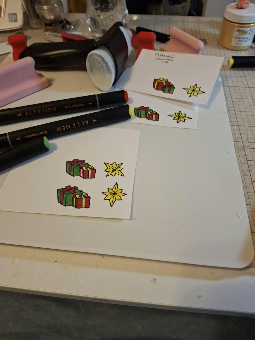 I love my new Altenew alcohol markers. I've been working on Christmas cards. They work well with various ink brands, and they especially work well with the Altenew Obsidian black ink.