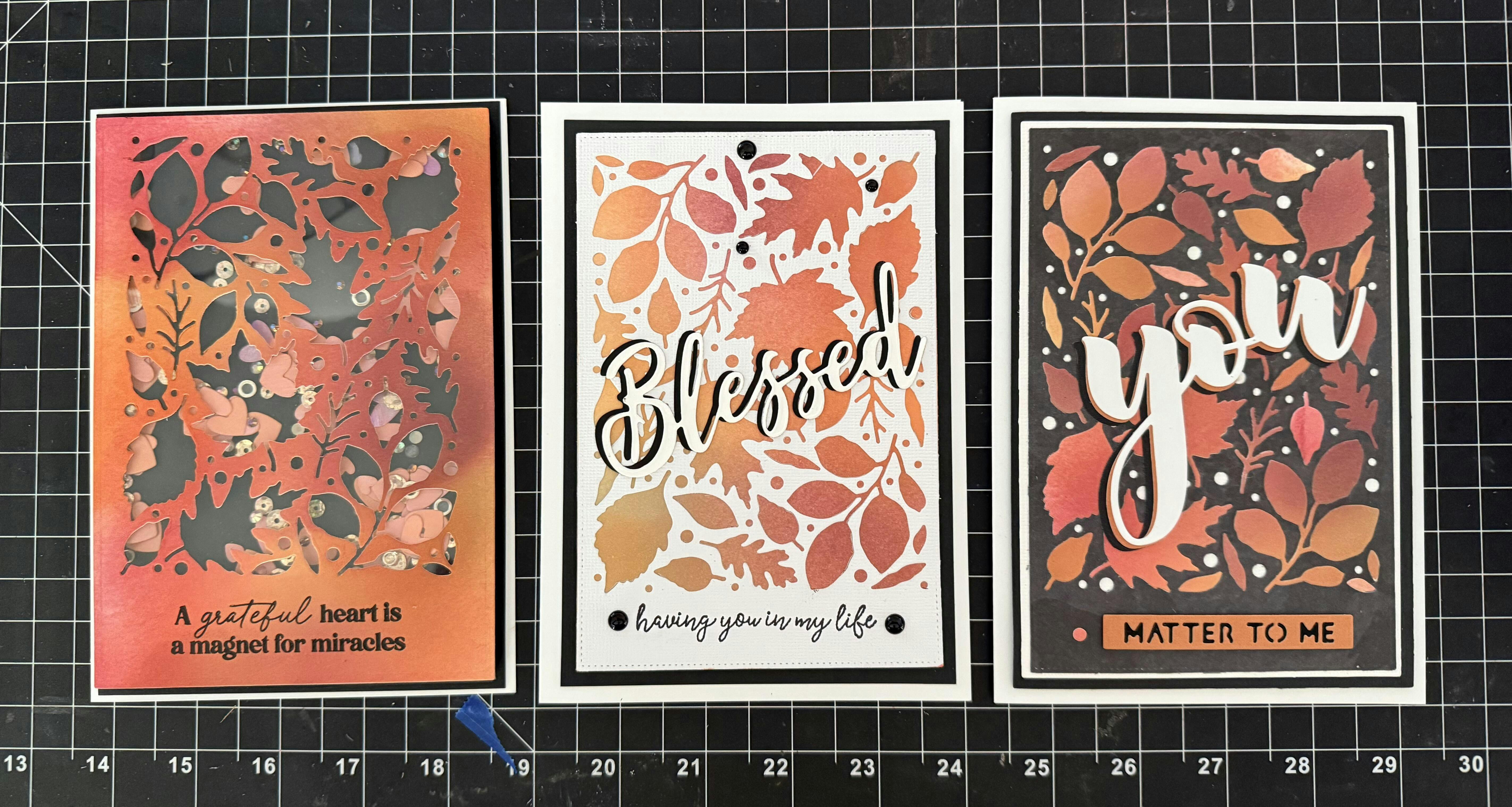 I love the fact that this Zero Waste die has many different shapes of leaves I can use and the sizes are perfect to make designs on A2 cards. So far I have cut out in white and ink blended leaf colors to get several different colors but will try in colored cardstock soon. Will try and use negative space and cut out leaves also. Thanks for a set I will use for many occasions.