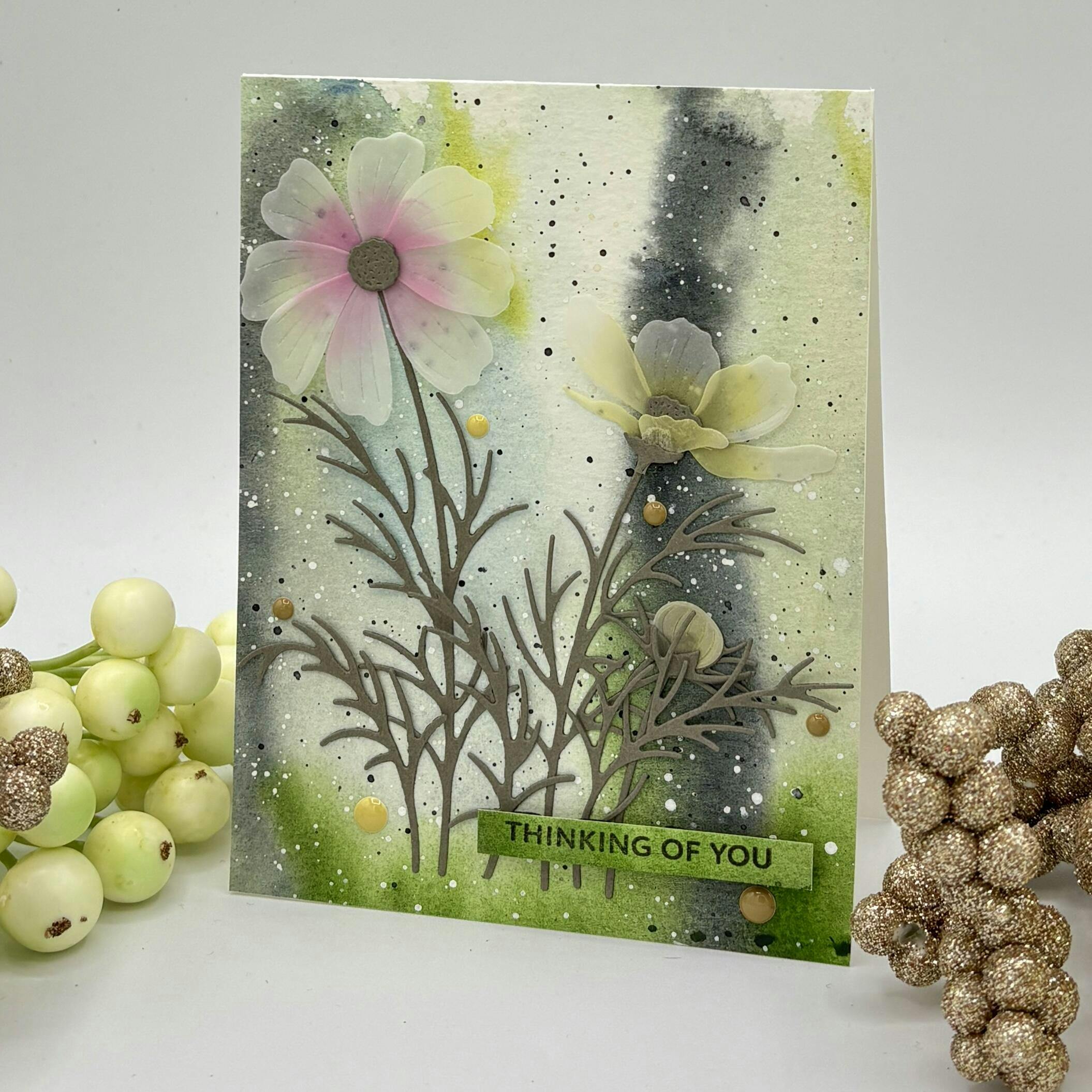 I have always thought of Cosmos as sort of a magical flower. It sways in a breeze seeming to float over its fragile stems and leaves. This layering die set puts the flower in my hands to create whimsical groupings on cards and scrapbook pages. It definitely is a wonderful addition to my stash.