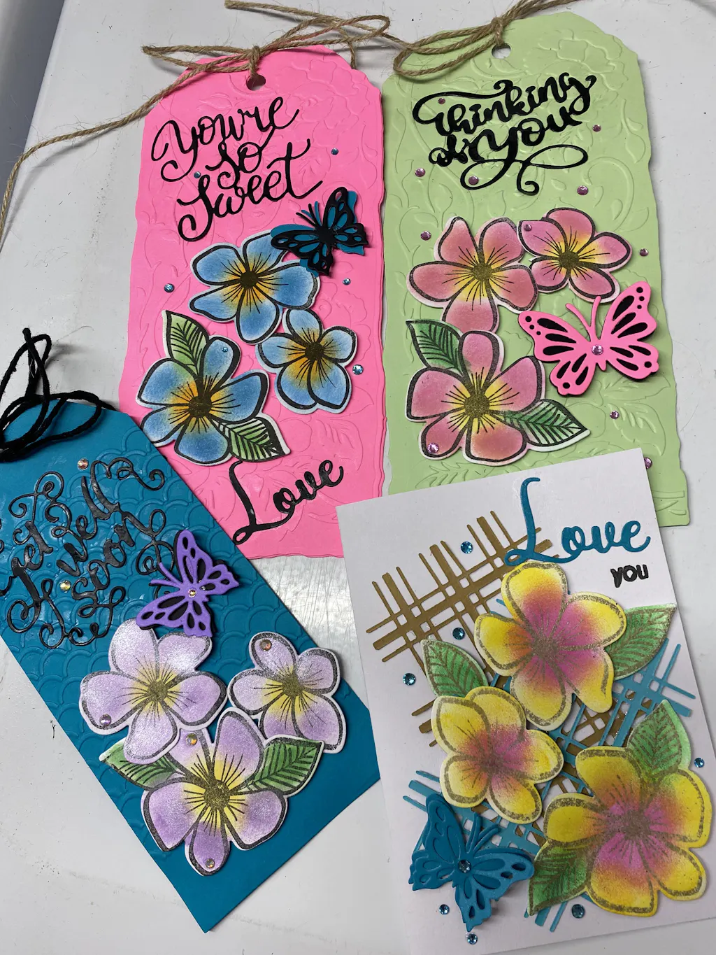 Die Dimensions: Small Flower: 1.5" x 1.7" ▪ Large Flower: 1.8" x 2.0" ▪ Flower with leaf: 2.4" x 2.2" ▪ Leaf 1: 1.3" x 0.9" ▪ Leaf 2: 0.7" x 1.0" ▪ Smile Big: 0.8" x 0.8" ▪ Hug Life: 1.0" x 1.0" ▪ Much Love: 1.0" x 0.9" ▪ Hey Beautiful: 2.2" x 1.3" ▪ Strive for Awesomeness: 2.6" x 1.3" ▪ Follow what feels good: 1.6" x 1.8"