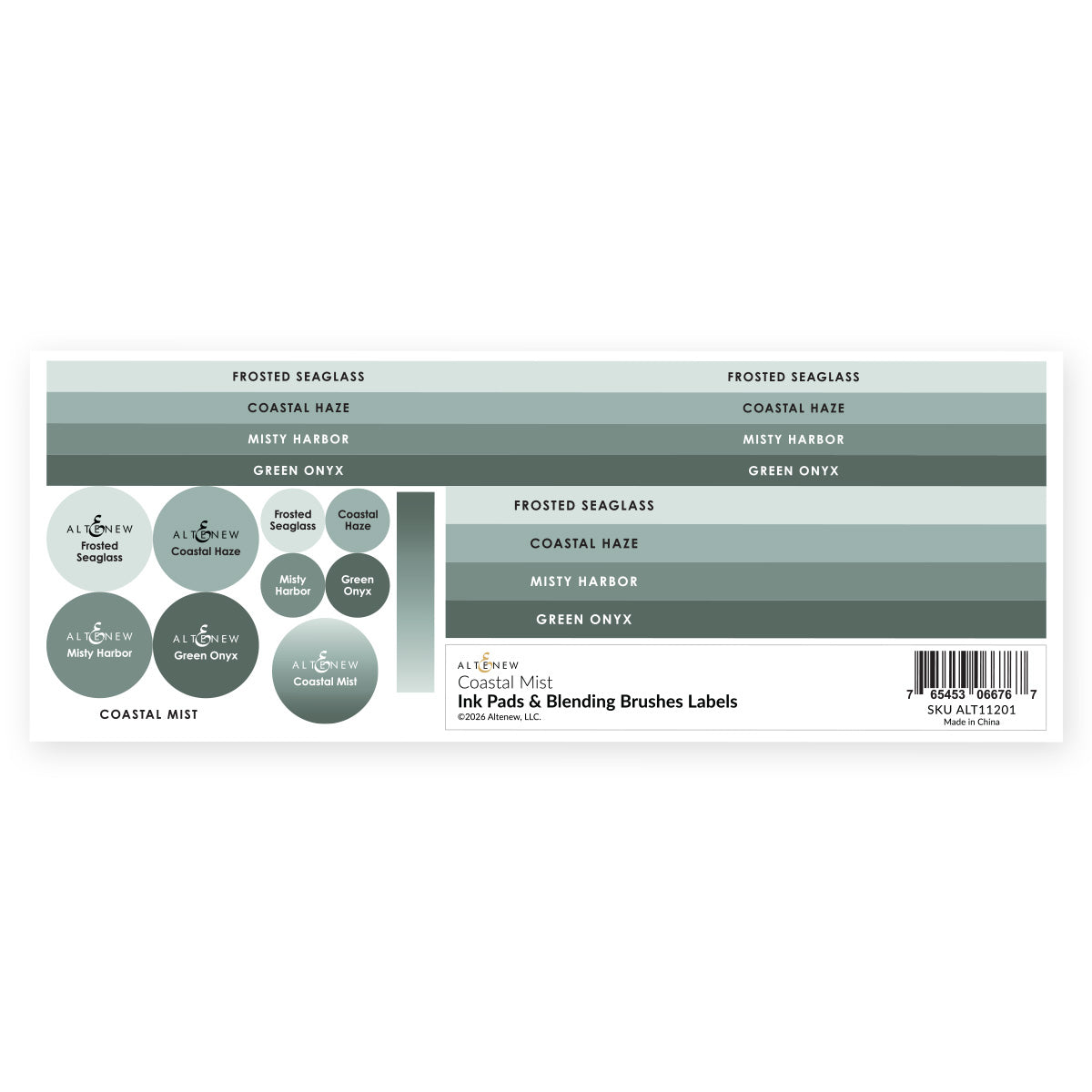 These labels are meant to be used with the Altenew Coastal Mist Fresh Dye Ink color family. They are designed to perfectly wrap around your round ink pads and mini cubes, and right on top of your small and mini blending brushes. With these labels, you can easily identify which inks are which, even with the caps off, and which blending brushes are for specific shades. Plus, they're so pretty to look at!