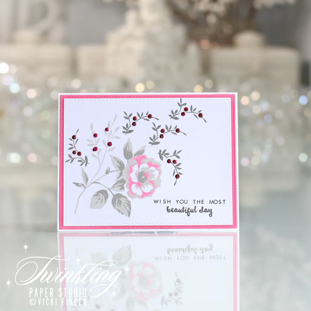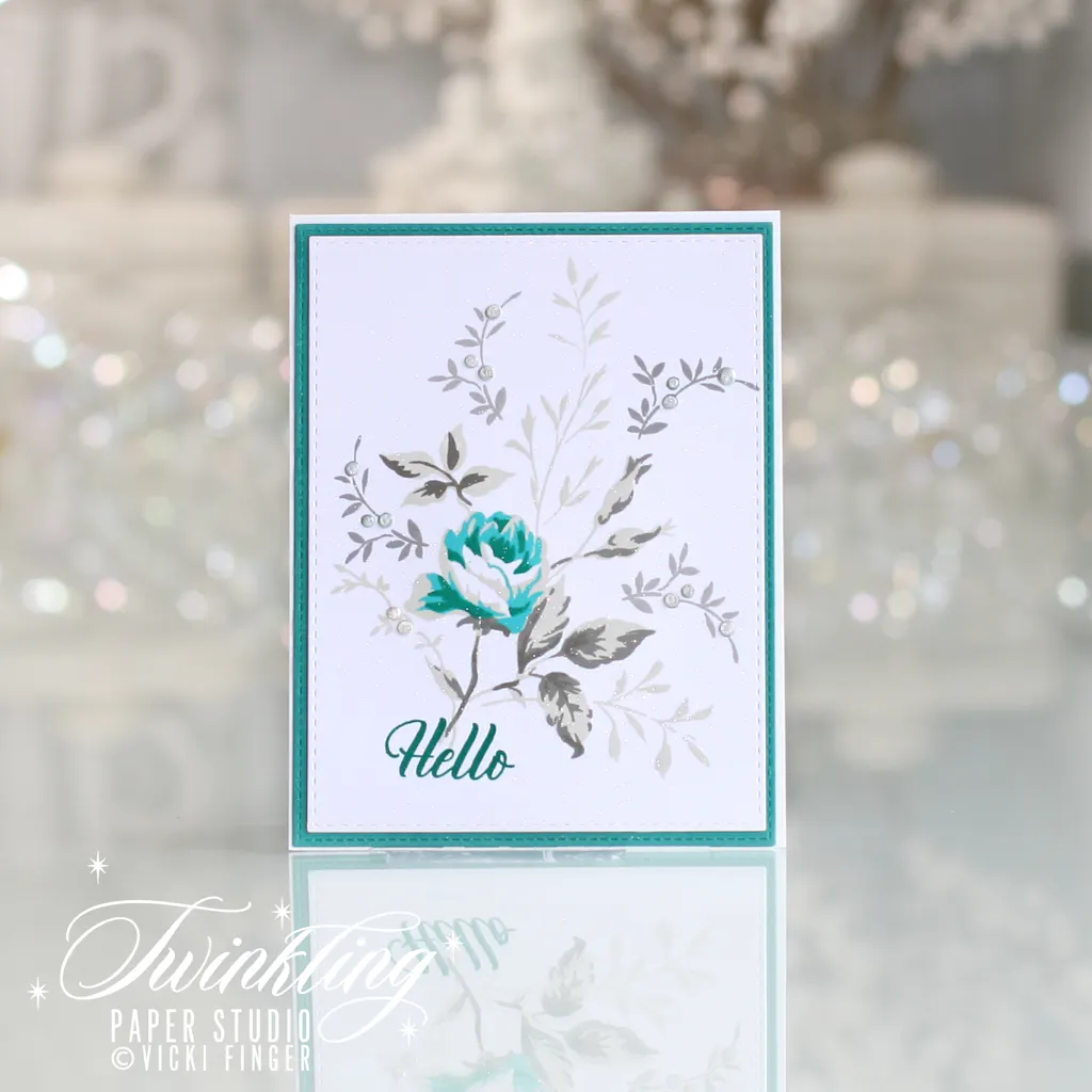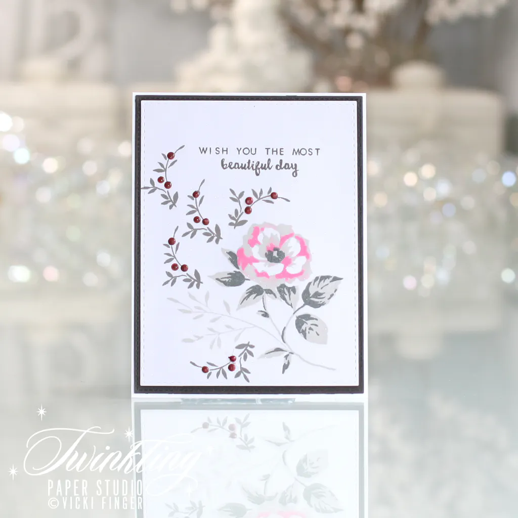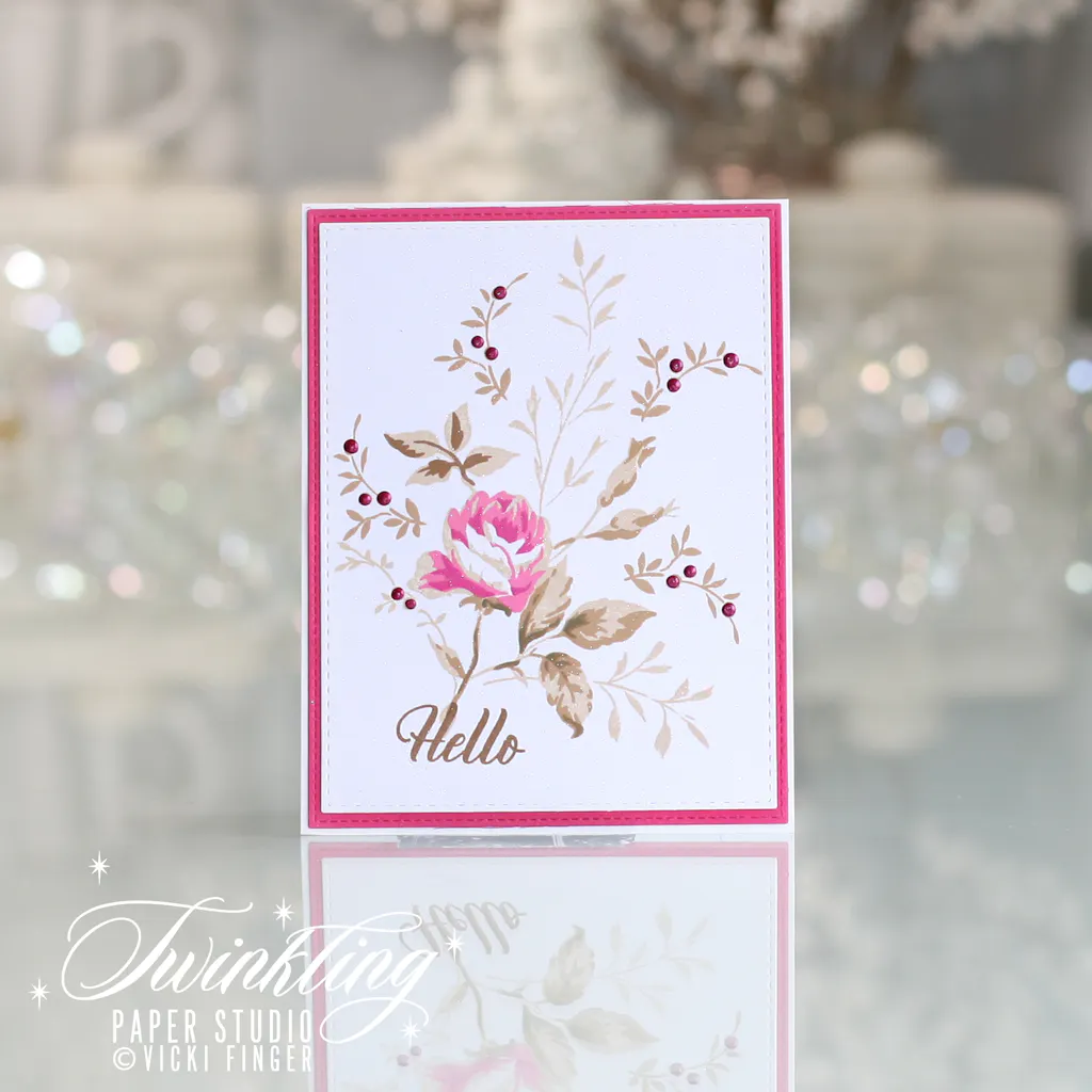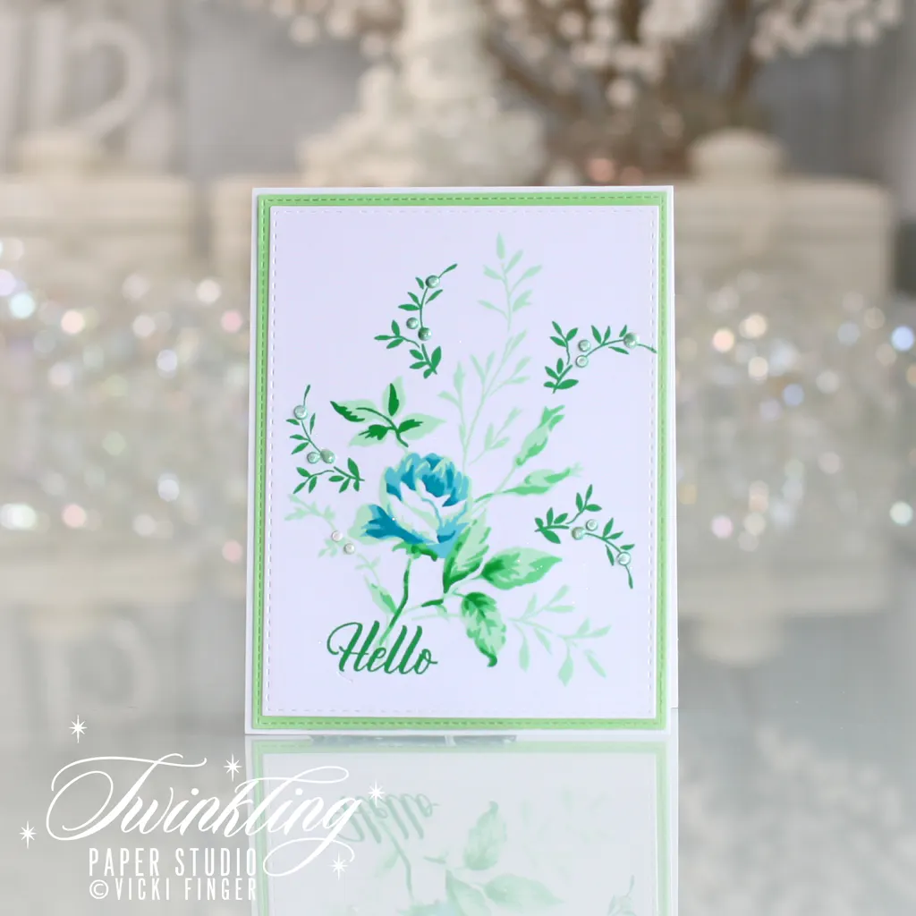 I find it challenging to have the blossom the same color as the foliage then stamping over the base color to make the flower look like a flower. Once that is achieved;however, it is stunning. I absolutely love the “daintiness” of the foliage.