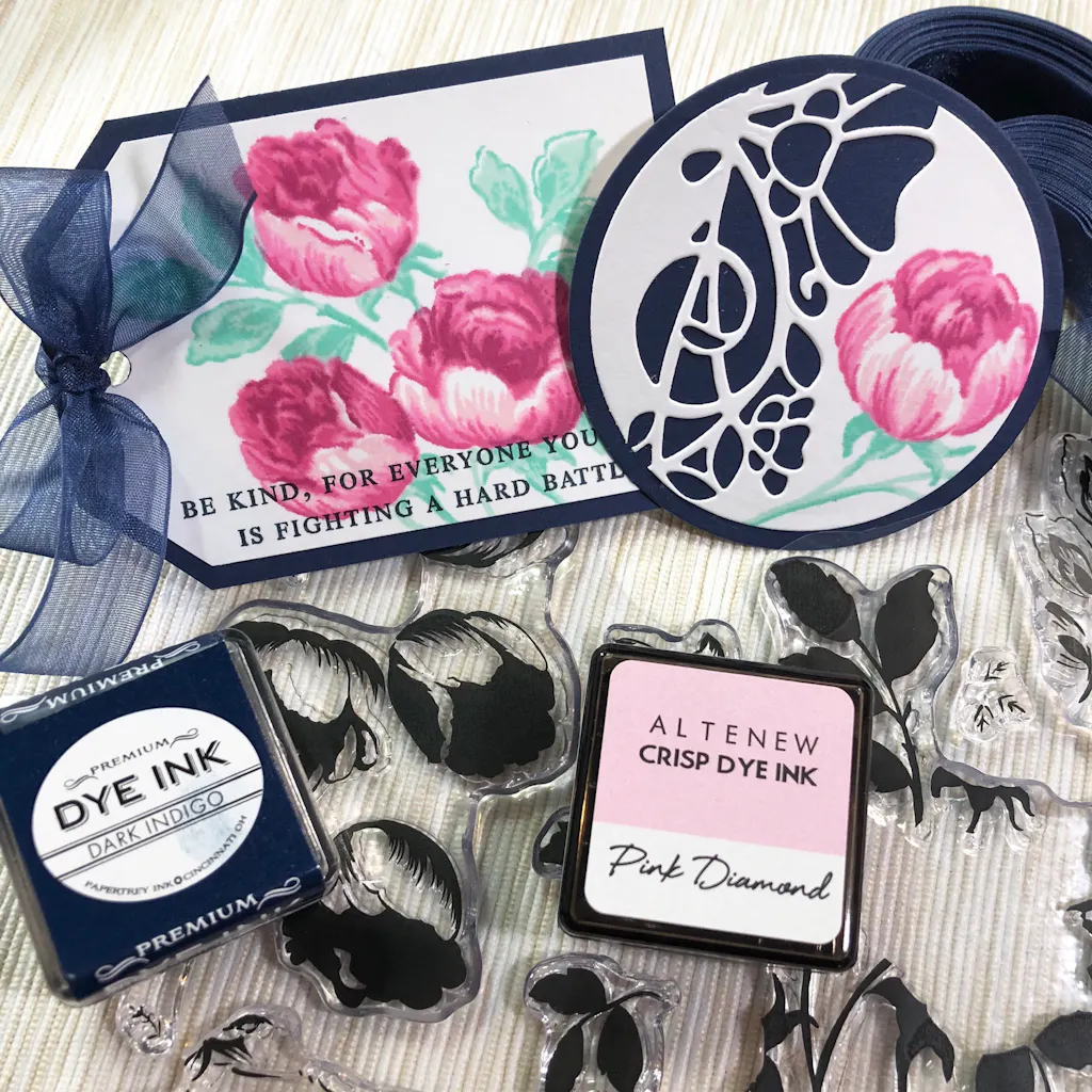 I just played with these today. They layer like a dream! And the flowers are gorgeous! This creates an entire bouquet. There are no individual flowers but they don’t overlap so you can use them separately if you wish. There are extra leaves though. I stamped the bouquet then cut it apart into an ATC and an ATC coin. I can totally see these in the corners of a card, up from the bottom and down from the top all the flowers pointing into the center. I can’t wait to play with it more. Fab quality as usual from Altenew.