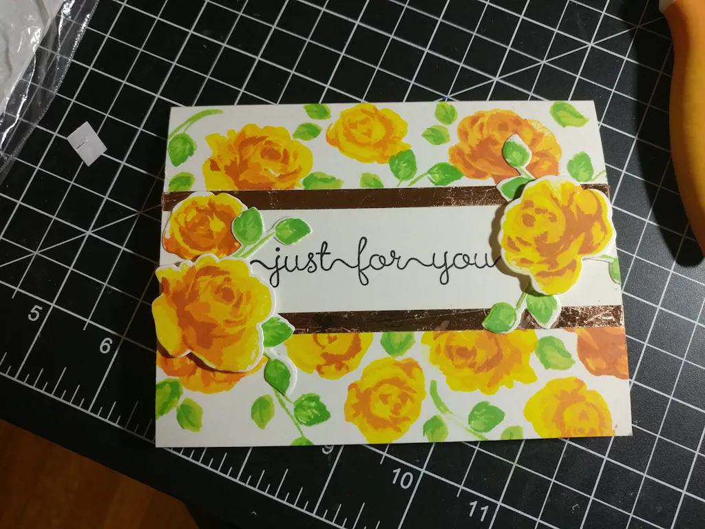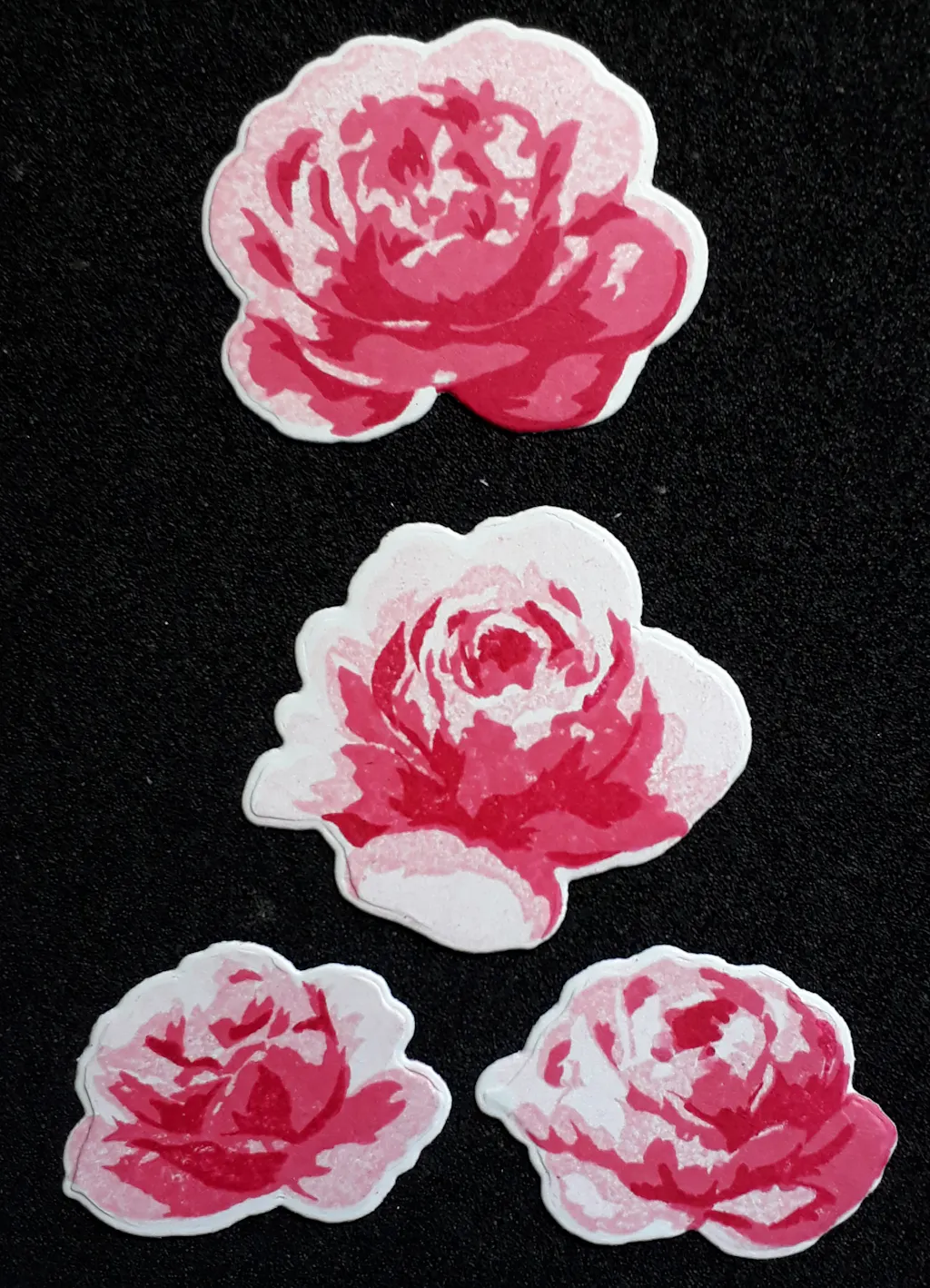 I received this rose stamp and die set the day before we left for vacation. I couldn't wait to play with them...so I brought them on vacation with me. It rained one of the days we were there and it was a perfect excuse to pull them out and play. I did the die cuts the night before we left and only brought a few supplies: my stamp platform, some mini stamp pads and a refillable water brush. I was so impressed on how beautiful they turned out. I've used other layering stamps before, but these were so much easier to figure out where each of the layers would go.
