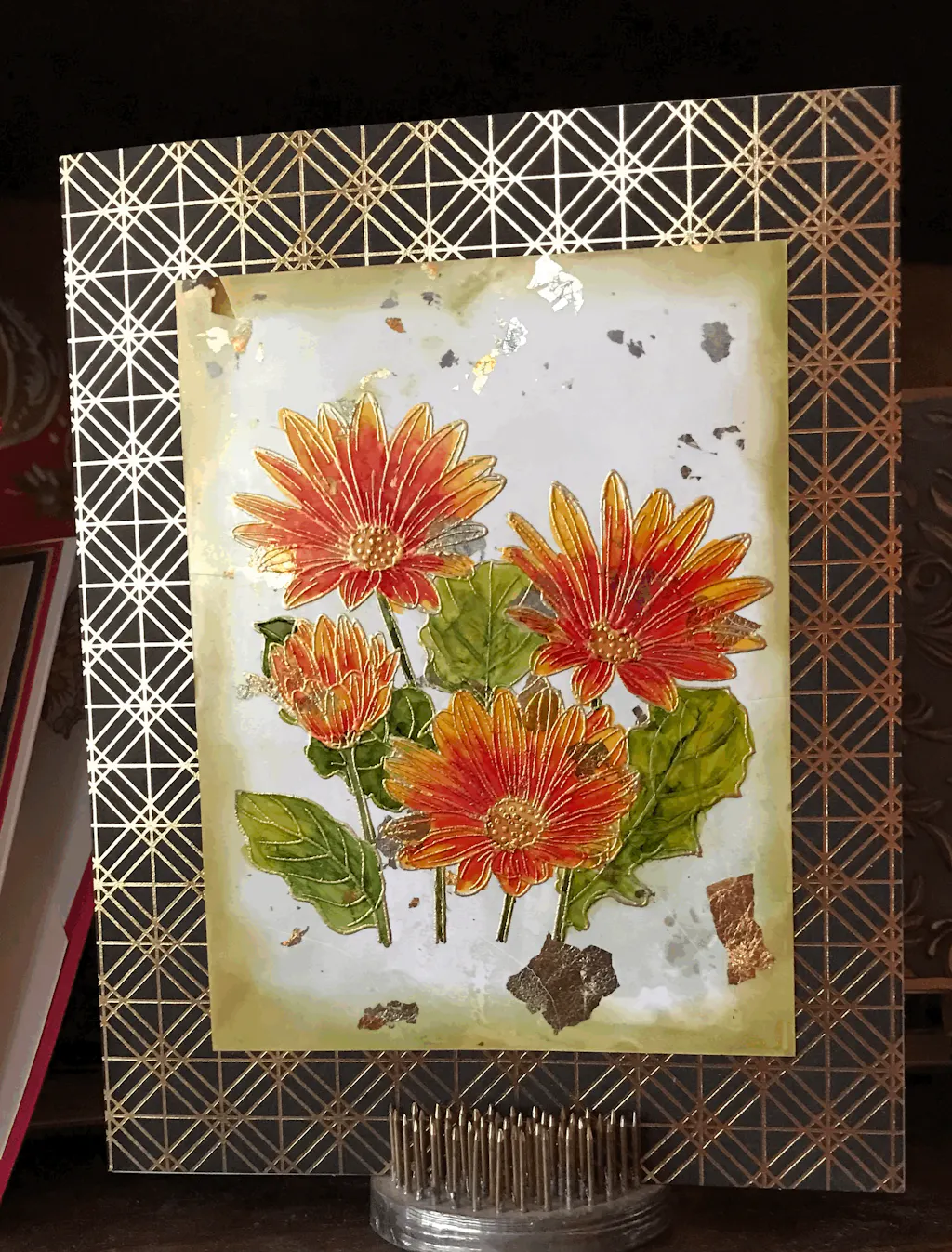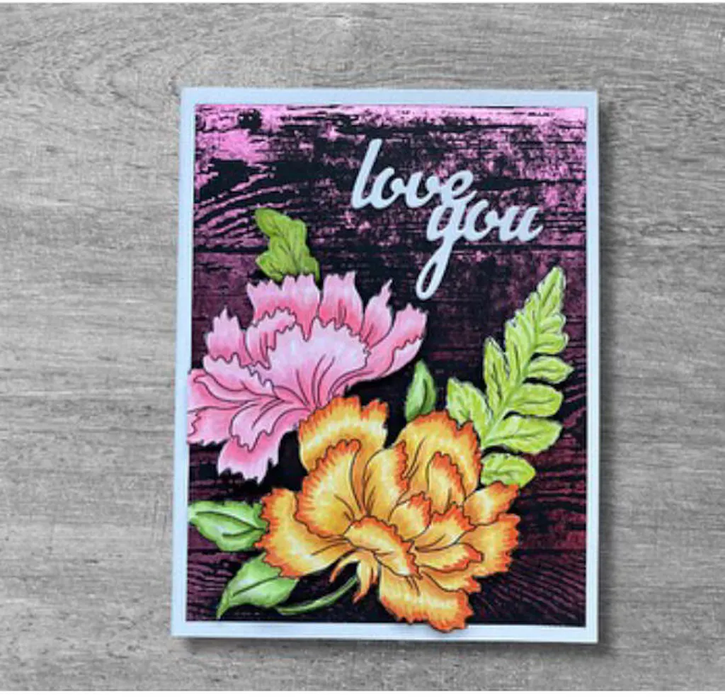The Dianthus Outline Stamp Set is a fabulous image to paint or color. Easy to pair with other products, such as the Carnations layering stamp set. Here I used a Press plate with hot foil for the background and alcohol markers to color the florals.