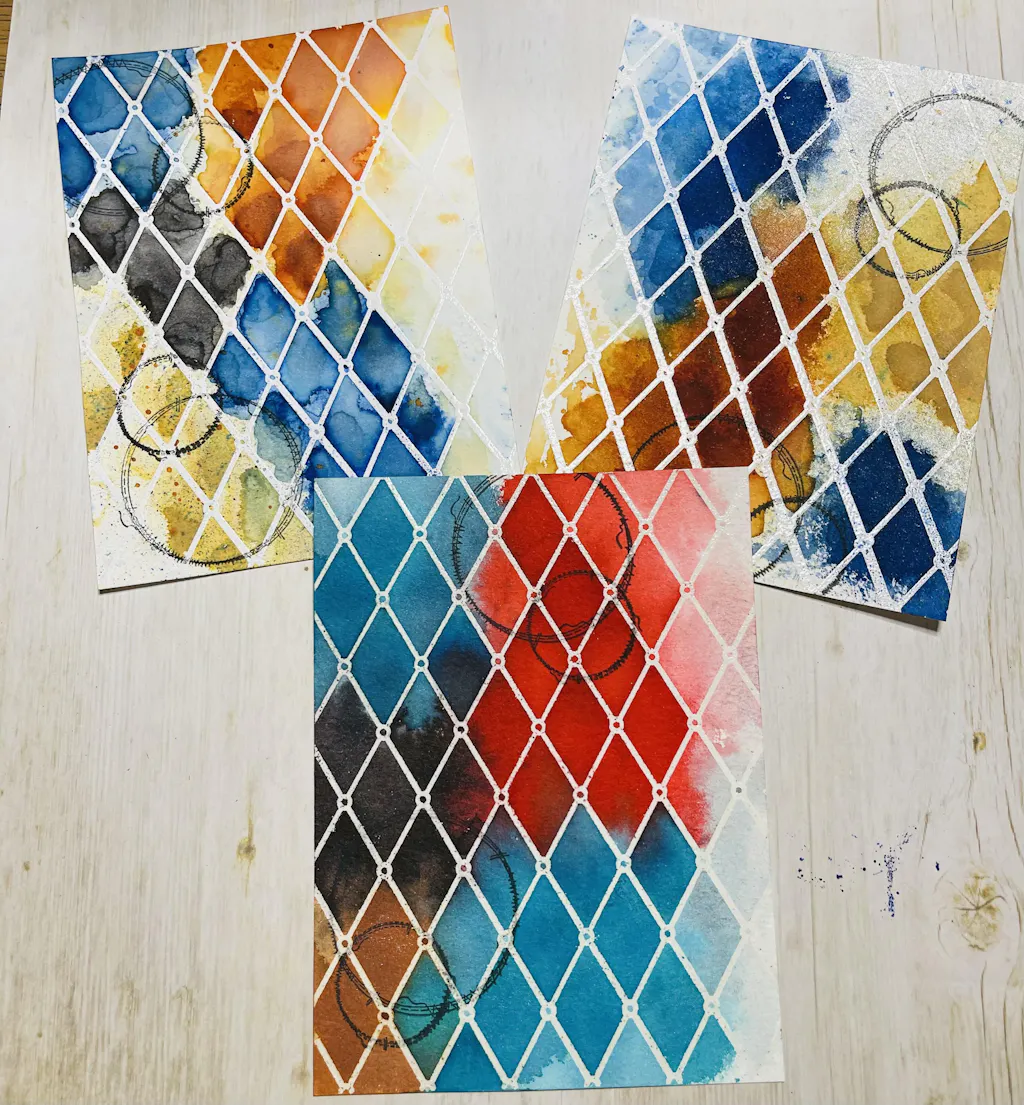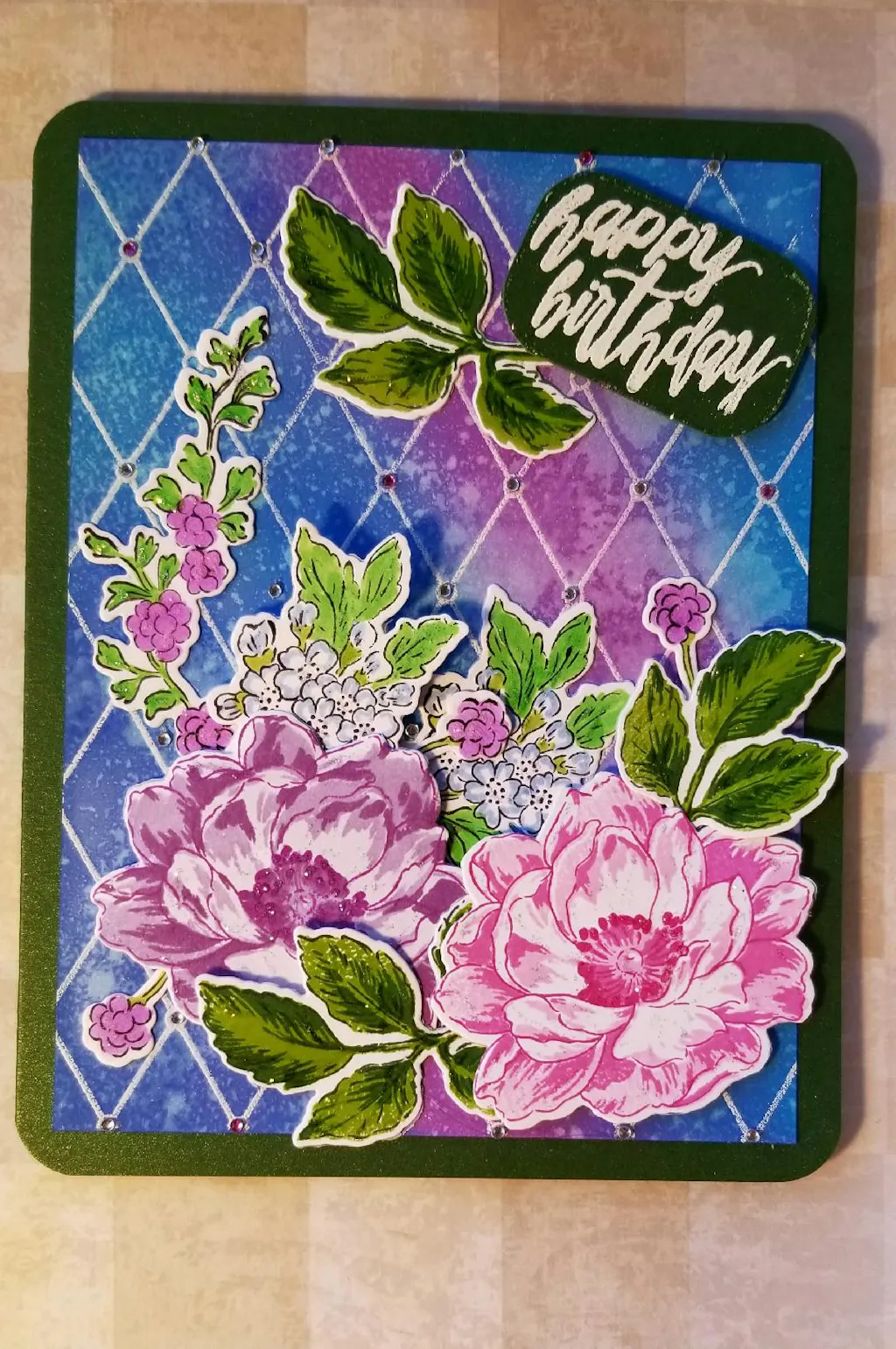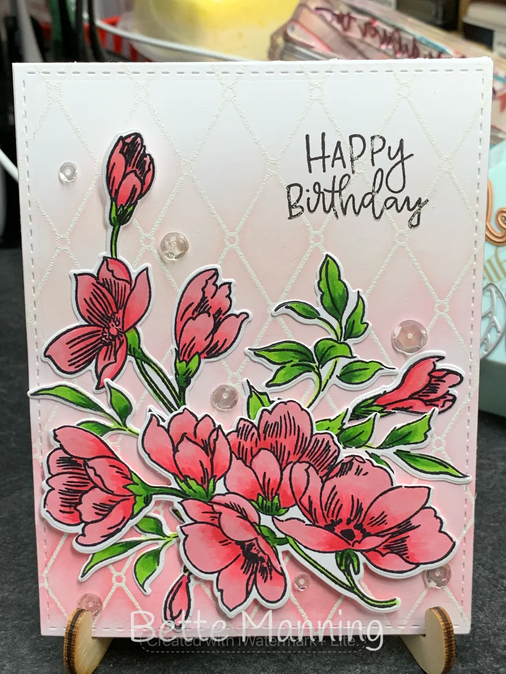 This stamp has so many possibilities to make beautiful backgrounds. My favorite is to clear emboss on watercolor cardstock and then to watercolor.
