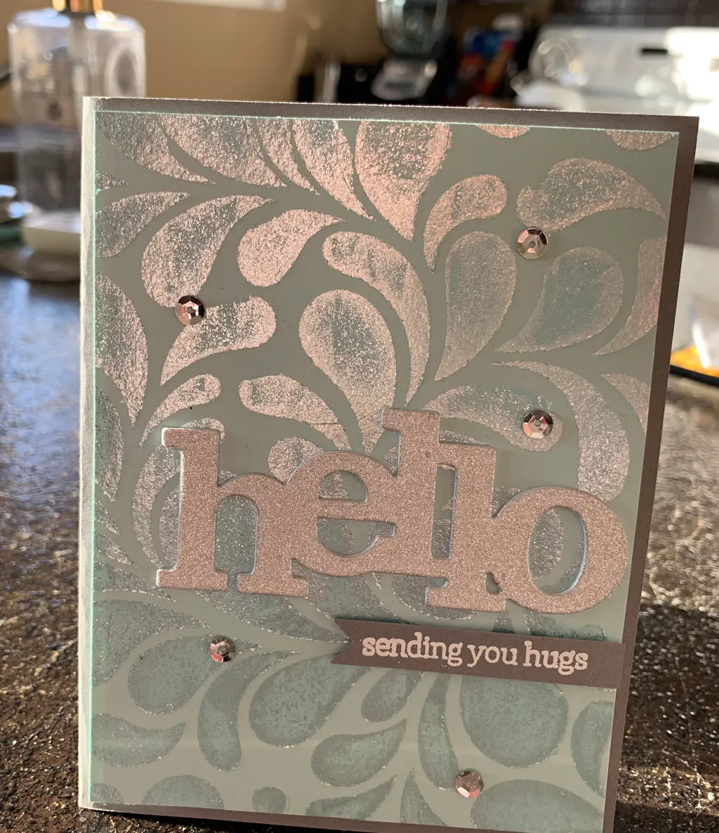 This stencil is my current favorite. It is 6 inches so easily covers an A2 card front. I used Nuvo Glacier paste on the card below.