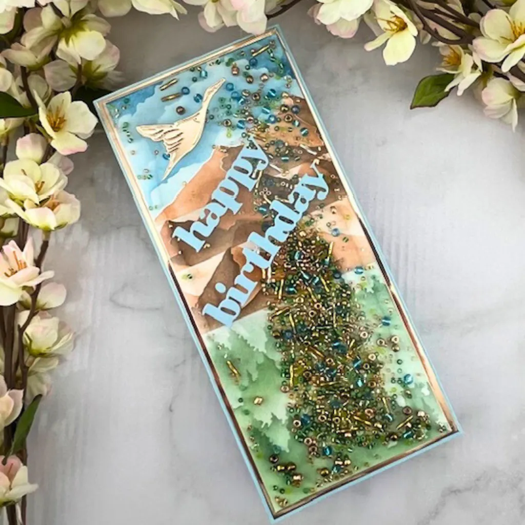 Create a mountain and tree scene on your next project with ease using this fun stencil. It is perfect for cards, as well as scrapbooking layouts to document your cherished memories.
