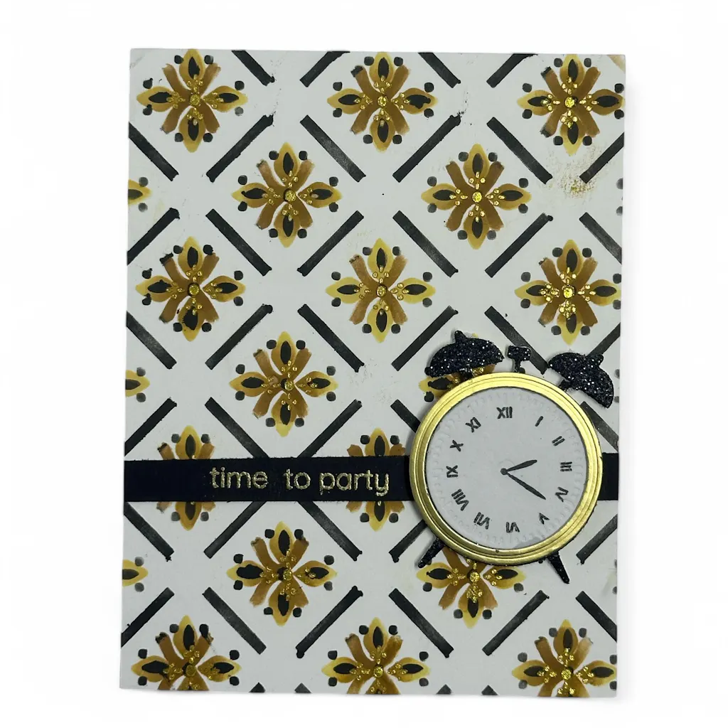 Place the stencil over the project area and secure it with washi tape, painter's tape, or any other repositionable adhesive. Add patterns to your project by blending inks, spraying mists, applying embossing paste, or adding glitter. Gently pull the stencil off from the project area to see the result.