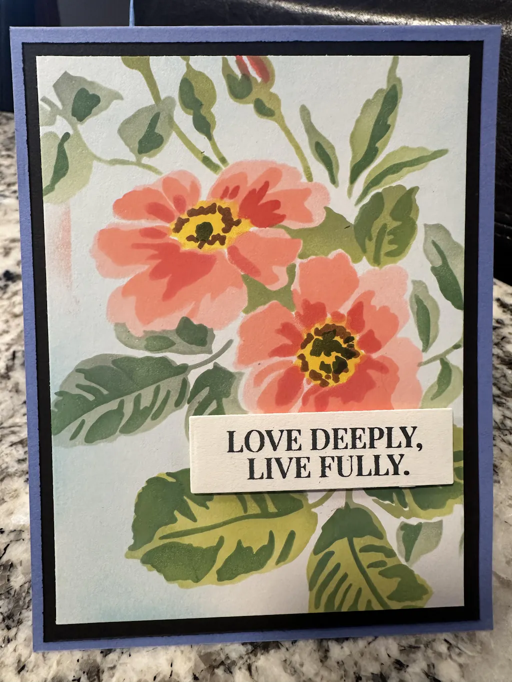 Didn't realize this had two designs til I got finished with the first one lol used oxide inks with large blending brushes. Pretty easy to use, though you may want to mask off the edge of the stencils in some places and part of the floral image in the smaller design. Larger design is pretty large but still usable for A2 sized cards - just have to choose how you want to crop it. Smaller design could make a large element or focal point on a card without cropping.