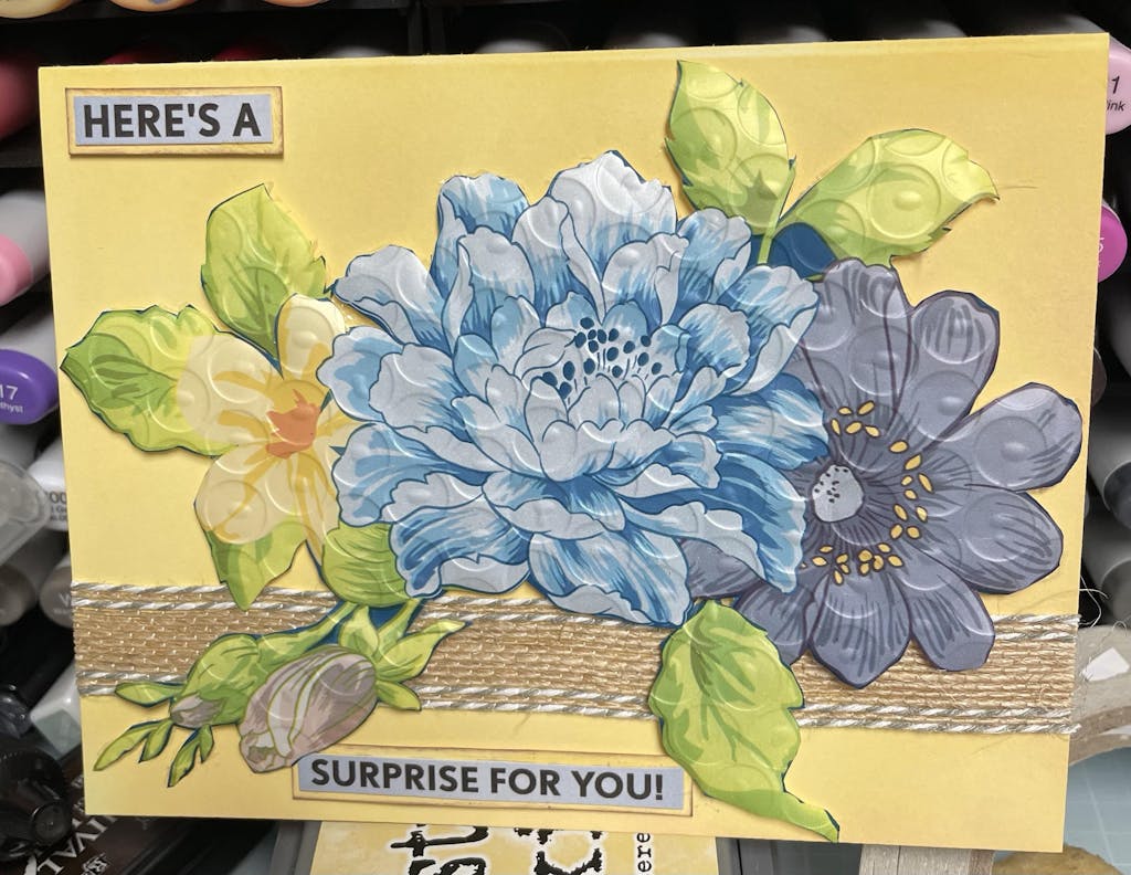 This mat has made my ink blending so much better, it holds the card very well, no more inked fingers. It will also hold your ink pad in place so you aren’t chasing it all over the desk. It makes doing stenciling a breeze too, it holds the stencil and the card in place. I am definitely saving money on buying tape to hold everything in place. It stays sticky and is very easy to clean. I started with the smaller one and I love it too, but the 9 x 12 gives you so much more working space. I love the packaging they use. I even made a card with it. Ink blended the card front on the sticky mat with oxide inks, then added the flowers from the packaging.