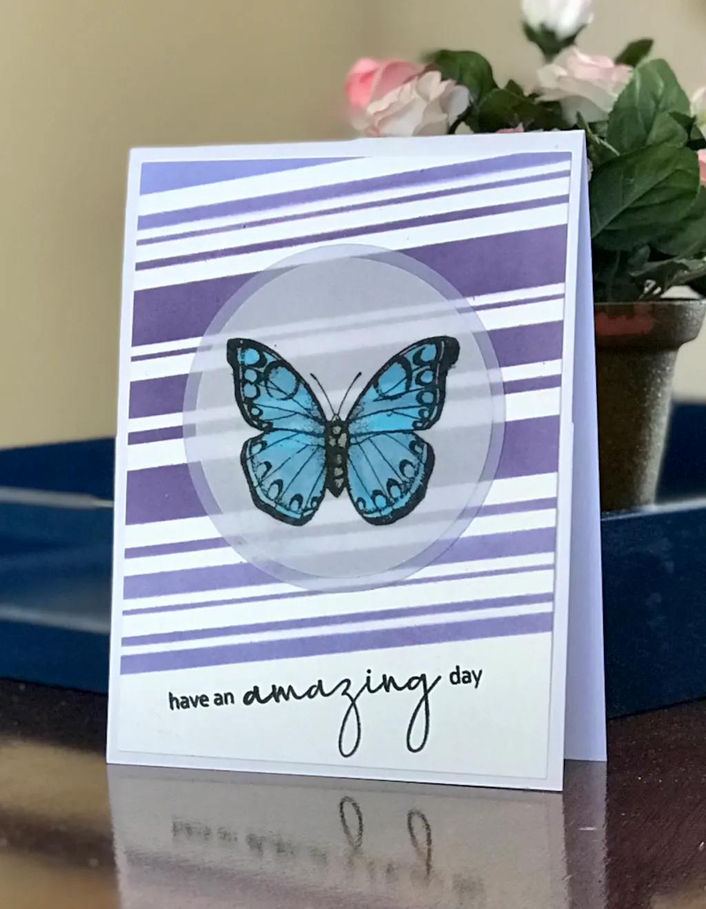 The Beach Towel Stripes Stencil is great for making quick fun backgrounds. I made a diagonal background and I think it looks great. The 6 x 6 inch size makes it easy to use it whatever direction you want. I'm looking forward to making lots of cards with it.