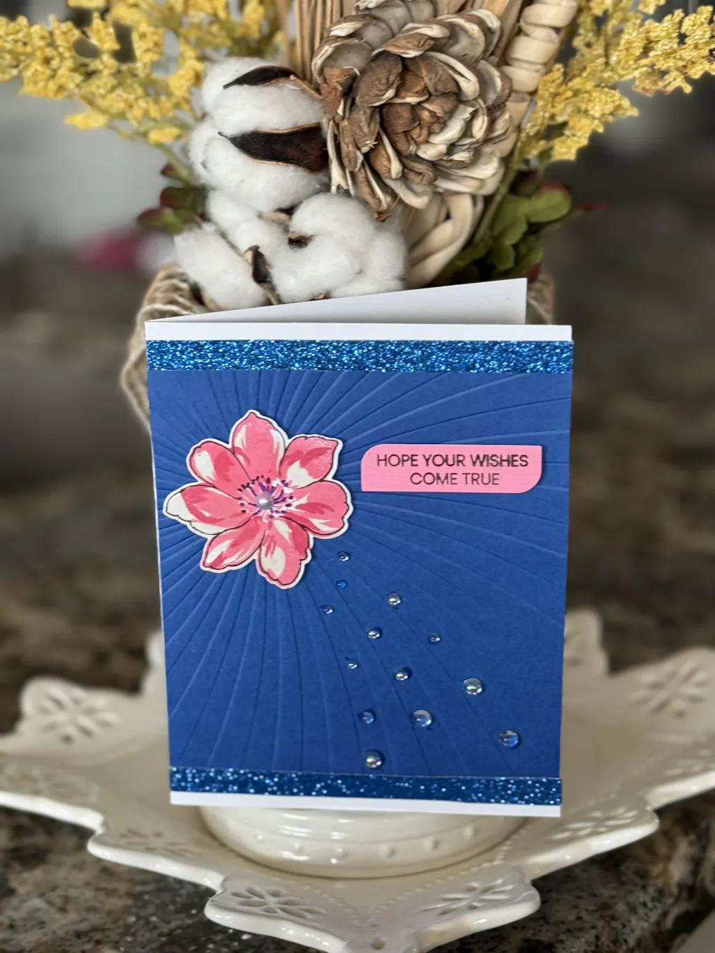 I created this card using a flower from the Garden Delight Stamp set and the Carnival Canopy background. It's the first time I used Altenew embellishments. Makes the flower look like a shooting star!