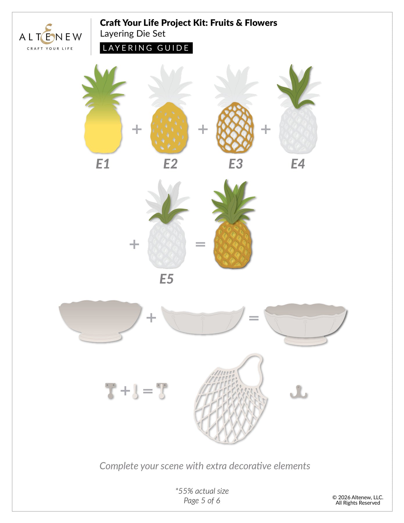 Die Dimensions: Fruit Bowl: 3.2" x 1.6" ▪ Shopping Mesh Bag: 2.5" x 3.7" ▪ Pineapple: 1.7" x 3.4" ▪ Banana: 1.5" x 1.9" ▪ Apple: 1.5" x 1.4" ▪ Peach: 1.2" x 1.2" ▪ Orange: 1.2" x 1.2" ▪ Hook: 0.4" x 0.6"