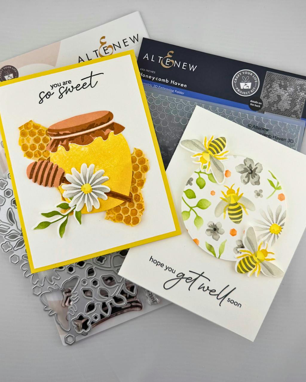 This is an amazing project kit with so many well-thought-out features! I love the Zero Waste die that die cuts all the little pieces from the stenciled background at once! The honeycomb embossing folder makes a fabulous background and can be used with pastes to create realistic honeycomb pieces, and the honey pot and honey dipper layering stamps are so sweet! The sentiments work perfectly with this set, too! Brilliant design, Altenew!
