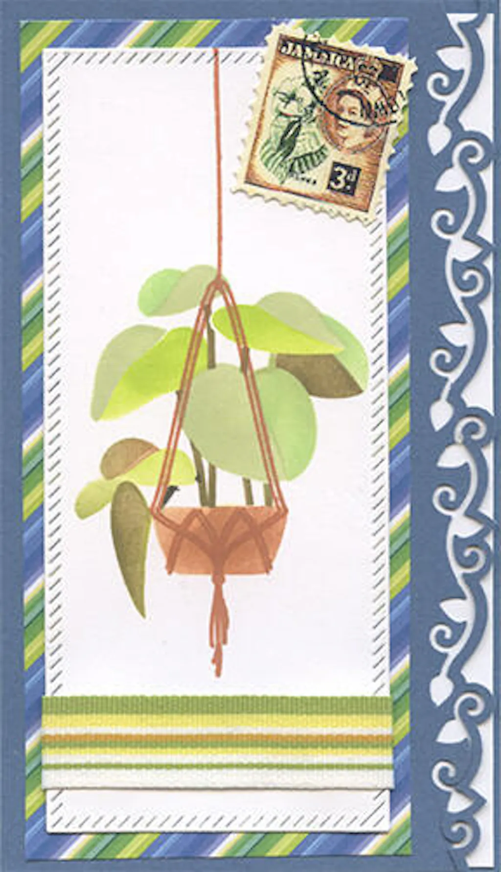 Designer's Tips: You can mix and match the three plants with the three containers in any arrangement you choose! First, ink blend the container, add the greenery, then stamp the coordinating macramé hanger.