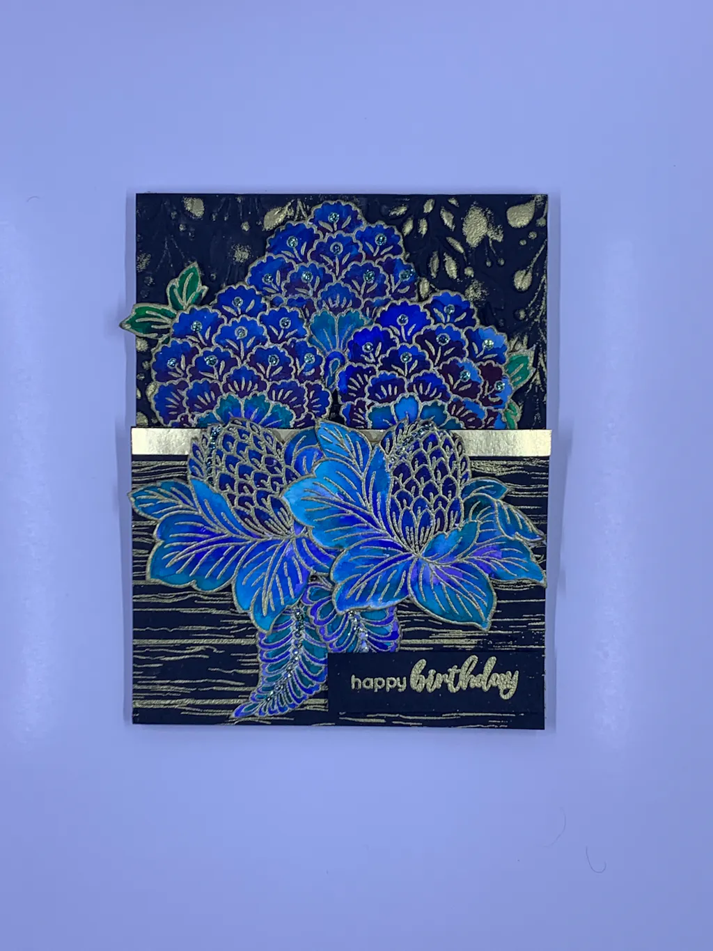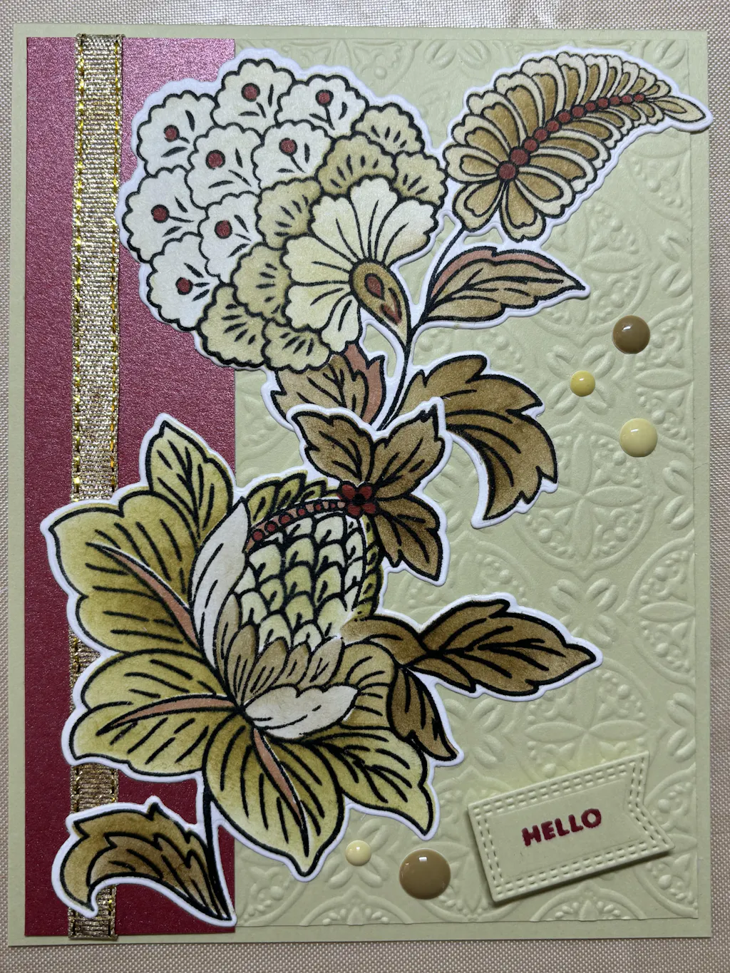 I enjoyed playing with colors with stencils and layering with this unusual Jacobean floral set. The tiny dot details were tricky for me to stamp because the stamp wanted to roll over or stick to my finger tips or tweezers when I made placement adjustments, but the results are well worth it. I thought stenciling them would be easier but on one flower they aren't included and on the other they are part of the larger element leaf top layer. But there is always the marker, pen or Nuvo drop option to fill how you want.
