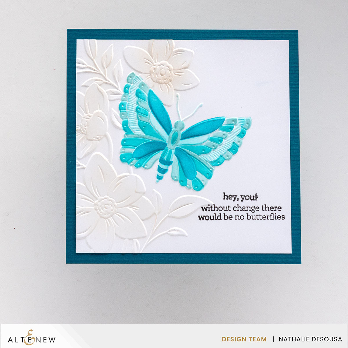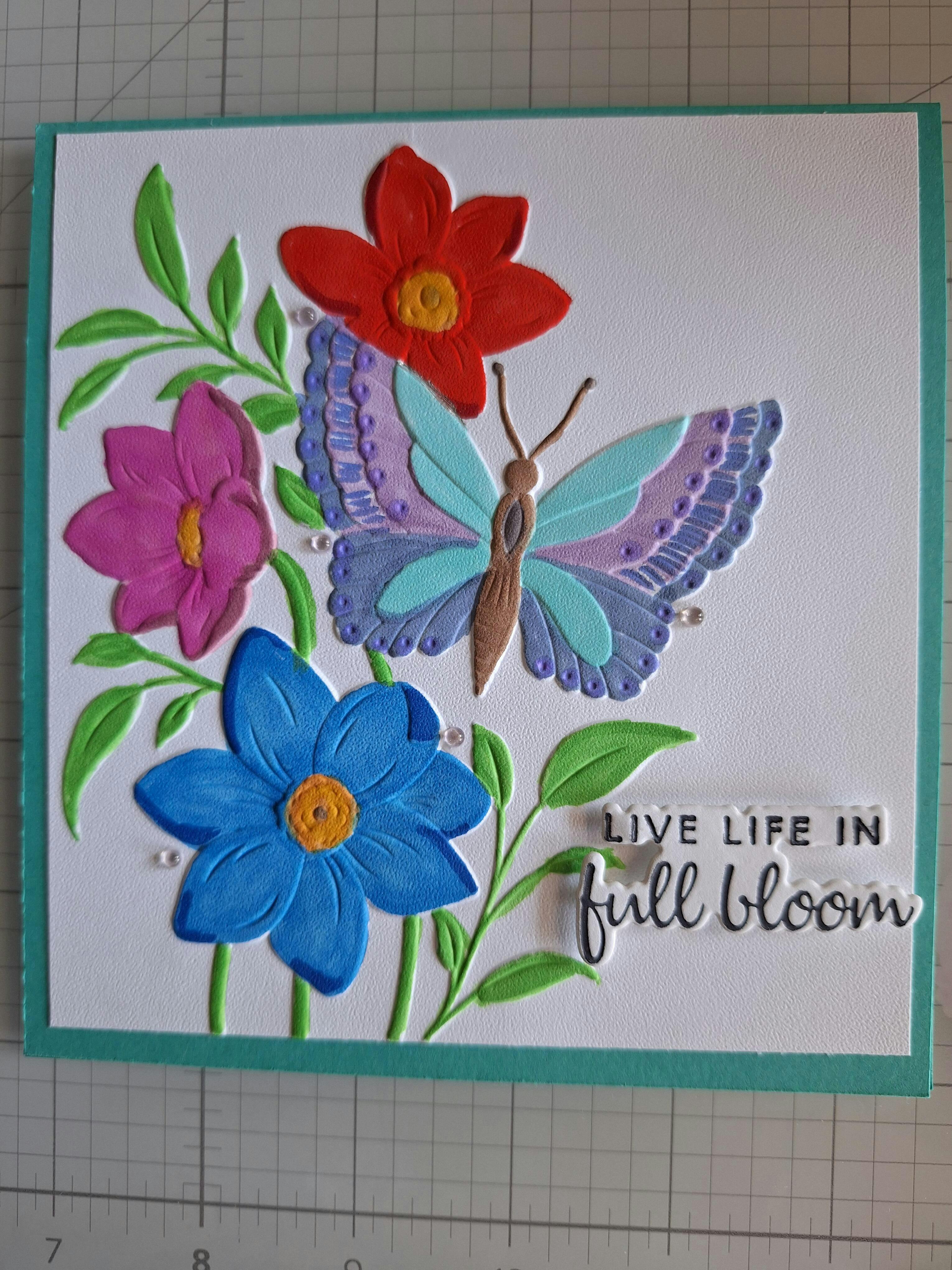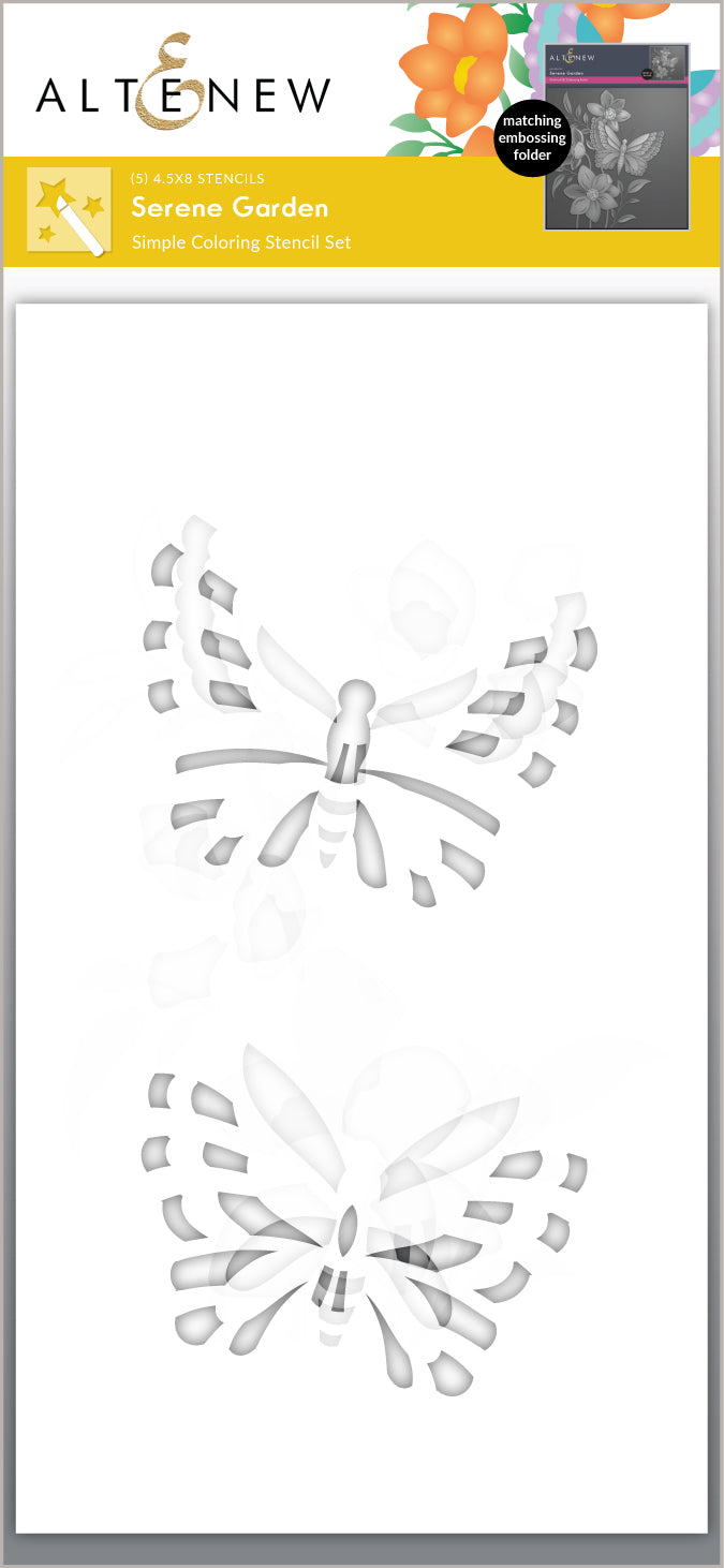 The 6" x 6" Serene Garden 3D Embossing Folder features a delicate butterfly resting on a flower, perfect for coloring and creativity. Pair it with a simple background stencil and an elaborate word die for stunning results!